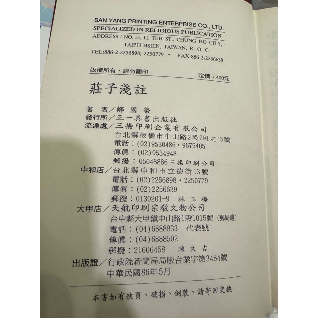 【823A-2】絕版書九成新,《莊子淺註》,鄒國榮,正一善書出版社,1997/05